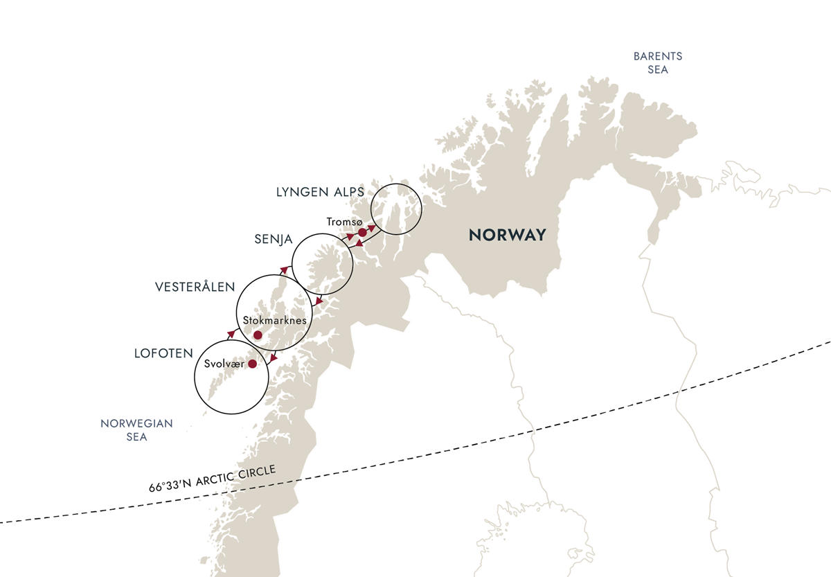 Res med HX Expeditions på en 8 dagars kryssning längs den norska kusten ombord på det moderna och bekväma fartyget MS Spitsbergen. Ni startar i Tromsö – ”Porten till Arktis” – och navigerar genom orörda vildmarker som de spetsiga Lyngsalperna, dramatiska Senja och de ikoniska fiskelägena i Lofoten.
