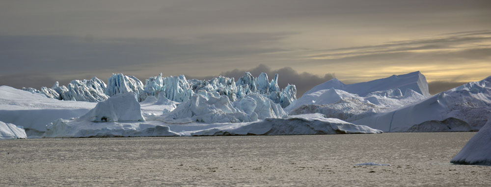 Ilulissat – isbergens huvudstad. Ilulissat betyder just "isberg" på grönländska och det gör det verkligen skäl av. Här bryts gigantiska isberg loss från inlandsisen och seglar ca 45 km till mynningen av fjorden där de går på grund då det där "bara" är ca 280 meter djupt. I området gar det bott folk i flera tusen år och vi kan fortfarande se lämningar från den tiden.